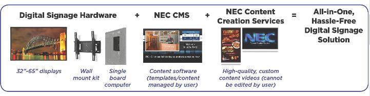 | All Bundles Include: -32" to 65" Digital Display -Wall Mount Bracket Kit -Single Board Computer -Ultrablok Surge Suppressor -Professional Installation -Free NEC CMS Software -2 Hour Content Creation Voucher |